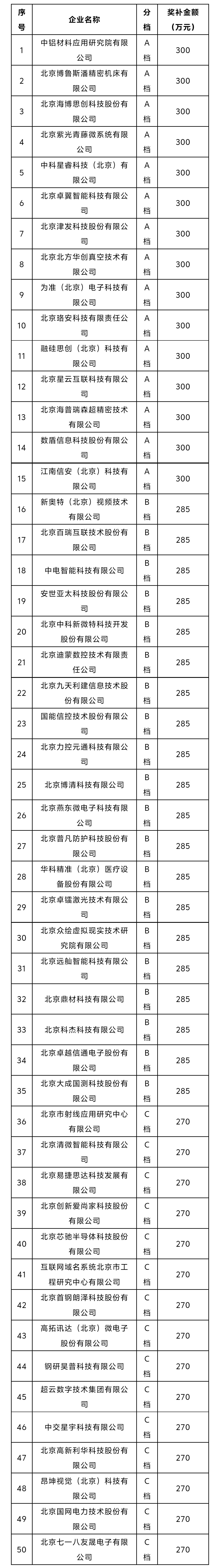 新一輪第一批重點“小巨人”企業(yè)高質(zhì)量發(fā)展項目期初獎補資金擬對中鋁材料應(yīng)用研究院有限公司等15家A檔企業(yè)、新奧特(北京)視頻技術(shù)有限公司等20家B檔企業(yè)、北京市射線應(yīng)用研究中心有限公司等15家C檔企業(yè)進行獎補,詳情見附件。