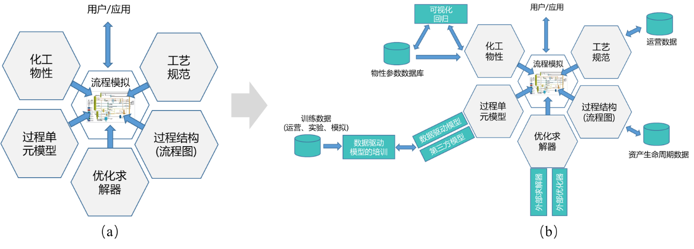 化工流程模擬軟件同樣向平臺化發展。化工流程模擬軟件應用于工藝設計、虛擬開車、操作員培訓、生產優化等工廠全生命周期。經過40多年發展,領先供應商的產品已經集成穩 態模擬與動態模擬、集成煉油模擬與化工模擬,主要包括5大功能模塊,即工藝規范、過程結構(流程圖) 、優化求解器、過程單元模型和化工物性,如圖2(a所示,并通過CAPE- OPEN軟件接口標準促進了通用流程模擬軟件平臺與單元模型、熱力學模型組件間的互操作。未來,化工流程模擬平臺軟件的5大模塊將進一步融合生產實時數據、實驗數據、資產生命周期數據,進一步集成第三方求解器、優化器、大數據模型、專用反應器模型、物性數據庫等,為打造石化工藝數字孿生提供平臺化支撐,如圖 2(b)所示。