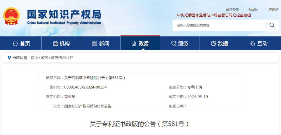 近日,國(guó)家知識(shí)產(chǎn)權(quán)局發(fā)布關(guān)于專利證書改版的公告(第581號(hào)),對(duì)于授權(quán)公告日在2024年6月1日之后(含當(dāng)日)的專利,國(guó)家知識(shí)產(chǎn)權(quán)局頒發(fā)新版專利證書。新版專利證書沿用A4規(guī)格豎排版式,優(yōu)化調(diào)整著錄事項(xiàng)布局。