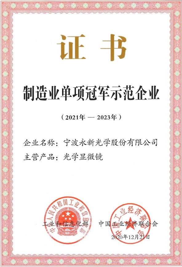 公司于2017年參與國家第二批制造業(yè)單項冠軍企業(yè)評選,并憑借產(chǎn)品——光學(xué)顯微鏡,成功入選第二批國家制造業(yè)單項冠軍培育企業(yè)。按照國家工信部要求,本次成功通過復(fù)評升級為國家級制造業(yè)“單項冠軍示范企業(yè)”,這既是國家與市場對永新光學(xué)產(chǎn)品的肯定,也是永新光學(xué)自身實力強有力的證明,有助于更好激發(fā)公司不斷開拓創(chuàng)新,積極研發(fā)新產(chǎn)品。