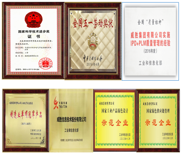 威勝榮獲國家級科技進步二等獎 1 項,中國專利優秀獎 1 項,其他省、市級科技獎多項。2016 年威勝榮獲國家工信部“2016 年智能制造試點示范項目、全國質量標桿企業 稱號,2017 年榮獲第五屆湖南省省長質量獎,2018 先后榮獲全國五一勞動獎狀 中國企業文化建設先進單位 2019 年三相電子式電能表成功入選工信部第四批制造業單項冠軍產品,2021 年榮獲國家工信部頒發的工業互聯網試點示范項目智能光伏試點示范企業2022 年榮獲國家級專精特新小巨人企業和中國電工技術學會科學技術獎科技進步一等獎,2023 年榮獲國家知識產權優勢企業、國家級工業產品綠色設計示范企業、國家級綠色供應鏈管理企業 稱號。