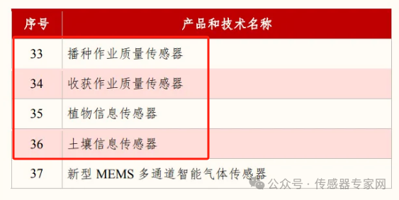 《目錄》儀器儀表領域中,基礎零部件和元器件共計37種,其中傳感器20種,有4種農業傳感器被“點名”列入,分別是:播種作業資料傳感器、收獲作業資料傳感器、植物信息傳感器、土壤信息傳感器。