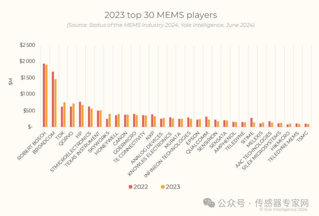 從全球MEMS廠商TOP 30名單來看,來自美國的廠商有Broadcom(博通)、Qorvo、Hewlett Packard(惠普)、Texas Instruments(德州儀器)、Skyworks、Honeywell(霍尼韋爾)、Analog Devices(ADI)、Knowles Electronics(樓氏電子)、Qualcomm(高通)、Sensata(森薩塔)、Amphenol(安費(fèi)諾)、Teledyne(FLIR,MEMS)、Si Time等,占據(jù)榜單的近一半。