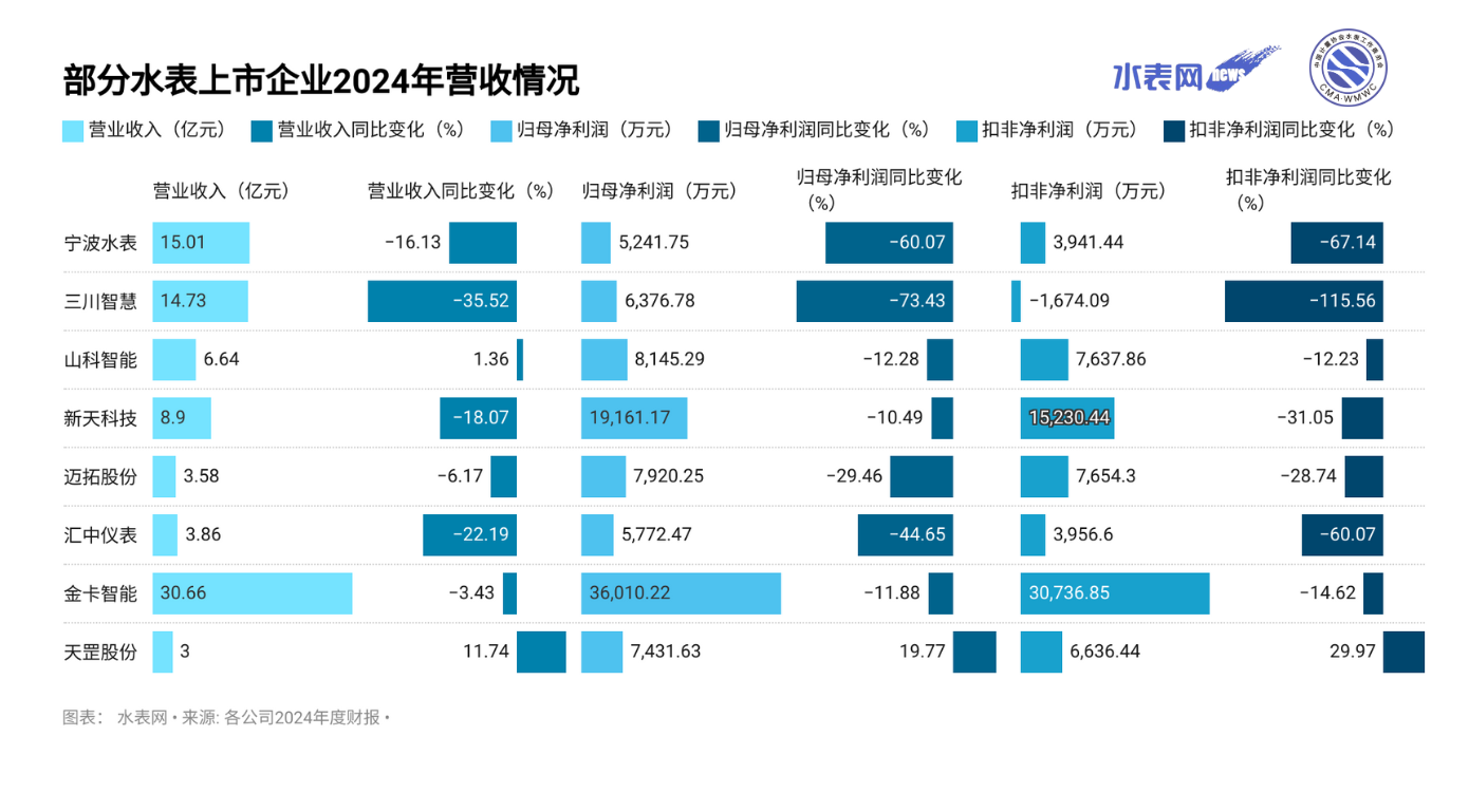 日前,多家水表上市企業發布2024年度財報。受宏觀經濟波動、行業需求收縮及供應鏈成本上升等多重挑戰影響,行業內營收增長承壓,多家表企營業收入、凈利潤同比下滑。