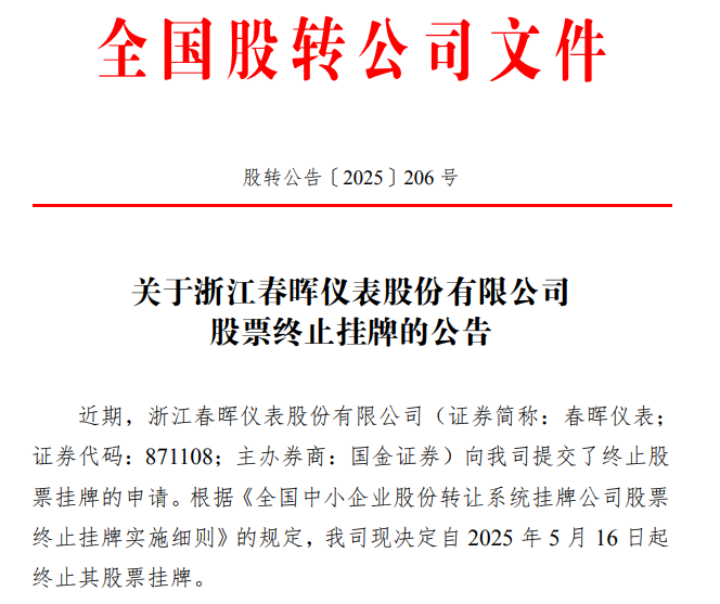 2025 年 5 月 13 日,全國(guó)中小企業(yè)股份轉(zhuǎn)讓系統(tǒng)有限責(zé)任公司發(fā)布股轉(zhuǎn)公告〔2025〕206 號(hào),宣布浙江春暉儀表股份有限公司(證券簡(jiǎn)稱:春暉儀表)向其提交了終止股票掛牌的申請(qǐng)。依據(jù)《全國(guó)中小企業(yè)股份轉(zhuǎn)讓系統(tǒng)掛牌公司股票終止掛牌實(shí)施細(xì)則》規(guī)定,全國(guó)股轉(zhuǎn)公司決定自 2025 年 5 月 16 日起終止春暉儀表股票掛牌。