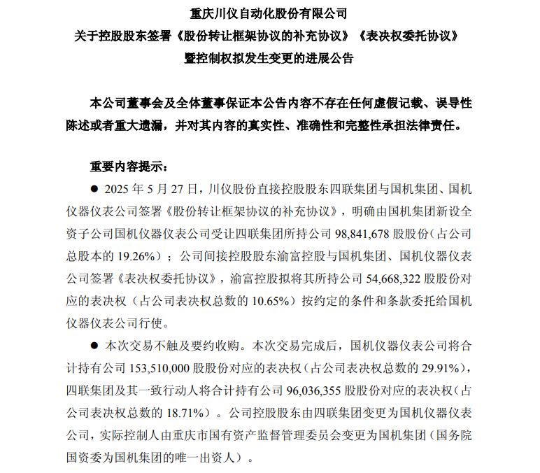 5月27日晚間,川儀股份(603100)公告,5月27日,公司直接控股股東四聯(lián)集團(tuán)與國機(jī)集團(tuán)、國機(jī)儀器儀表公司簽署《股份轉(zhuǎn)讓框架協(xié)議的補(bǔ)充協(xié)議》,明確由國機(jī)集團(tuán)新設(shè)全資子公司國機(jī)儀器儀表公司受讓四聯(lián)集團(tuán)所持公司98,841,678股股份(占公司總股本的19.26%);公司間接控股股東渝富控股與國機(jī)集團(tuán)、國機(jī)儀器儀表公司簽署《表決權(quán)委托協(xié)議》,渝富控股擬將其所持公司54,668,322股股份對應(yīng)的表決權(quán)(占公司表決權(quán)總數(shù)的10.65%)按約定的條件和條款委托給國機(jī)儀器儀表公司行使。