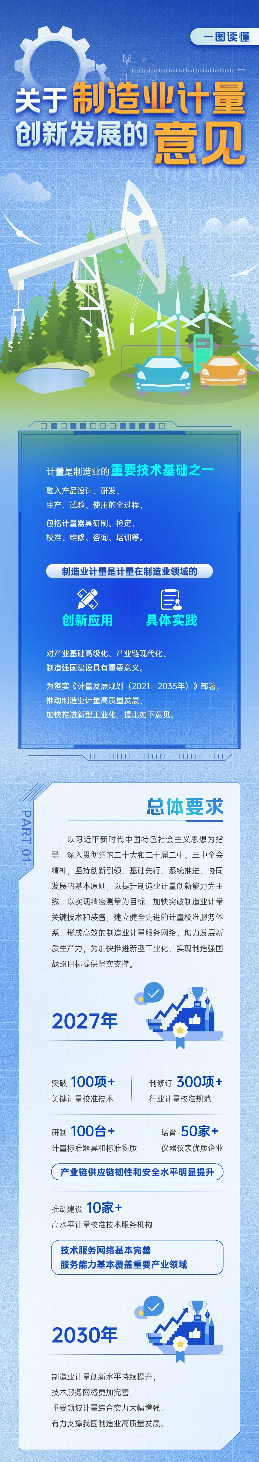 《意見》是制造業(yè)計(jì)量領(lǐng)域首個(gè)政策性文件,堅(jiān)持創(chuàng)新引領(lǐng)、基礎(chǔ)先行、系統(tǒng)推進(jìn)、協(xié)同發(fā)展的基本原則,以提升制造業(yè)計(jì)量創(chuàng)新能力為主線,以實(shí)現(xiàn)精密測量為目標(biāo),結(jié)合當(dāng)前產(chǎn)業(yè)現(xiàn)狀和制造業(yè)高質(zhì)量發(fā)展要求,提出到2027年,制造業(yè)計(jì)量發(fā)展取得積極進(jìn)展,突破100項(xiàng)以上關(guān)鍵計(jì)量校準(zhǔn)技術(shù),制修訂300項(xiàng)以上行業(yè)計(jì)量校準(zhǔn)規(guī)范,研制100臺(tái)套以上計(jì)量器具和標(biāo)準(zhǔn)物質(zhì),產(chǎn)業(yè)鏈供應(yīng)鏈韌性和安全水平明顯提升,培育50家以上儀器儀表優(yōu)質(zhì)企業(yè),推動(dòng)建設(shè)10家以上制造業(yè)高水平計(jì)量校準(zhǔn)技術(shù)服務(wù)機(jī)構(gòu),技術(shù)服務(wù)網(wǎng)絡(luò)基本完善,服務(wù)能力基本覆蓋重要產(chǎn)業(yè)領(lǐng)域。到2030年,制造業(yè)計(jì)量創(chuàng)新水平持續(xù)提升,技術(shù)服務(wù)網(wǎng)絡(luò)更加完善,重要領(lǐng)域計(jì)量綜合實(shí)力大幅增強(qiáng),有力支撐我國制造業(yè)高質(zhì)量發(fā)展。