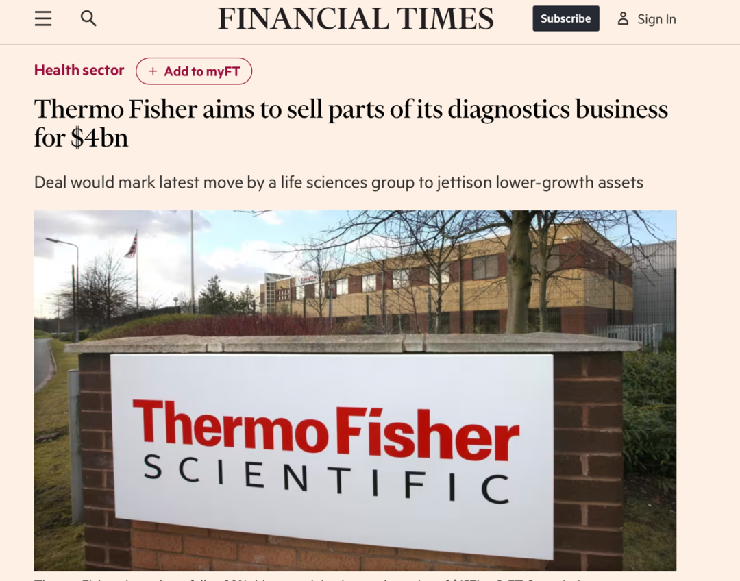 待售的診斷業(yè)務(wù)部門年調(diào)整后收益約3億美元,年銷售額達(dá)14億美元,約占賽默飛世爾整體專業(yè)診斷事業(yè)部收入的三分之一。知情人士補(bǔ)充稱,公司期望以超40億美元的價(jià)格完成交易。