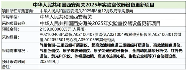 中華人民共和國西安海關(guān)2025年8至12月政府采購意向-中華人民共和國西安海關(guān)2025年實驗室儀器設(shè)備更新項目詳細(xì)情況