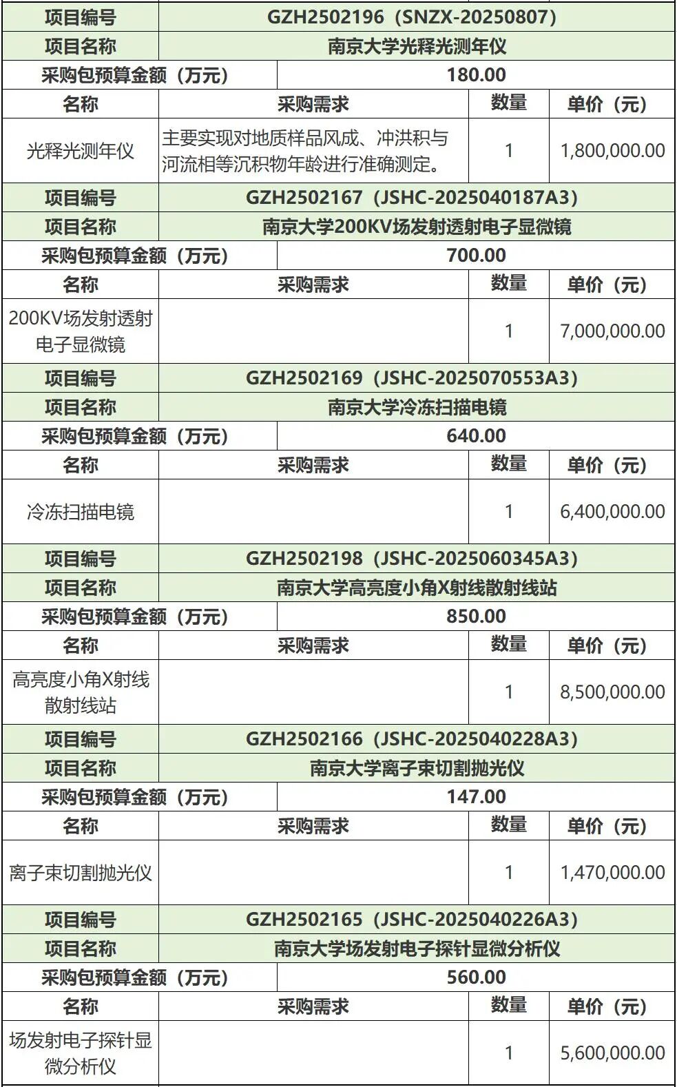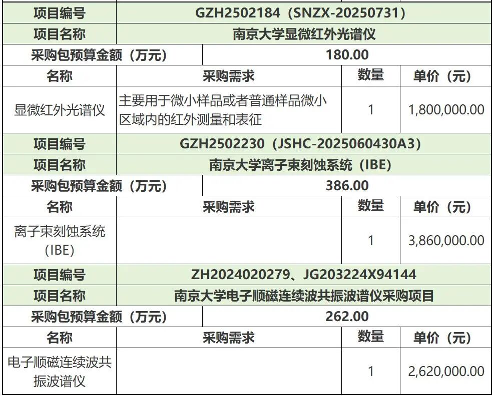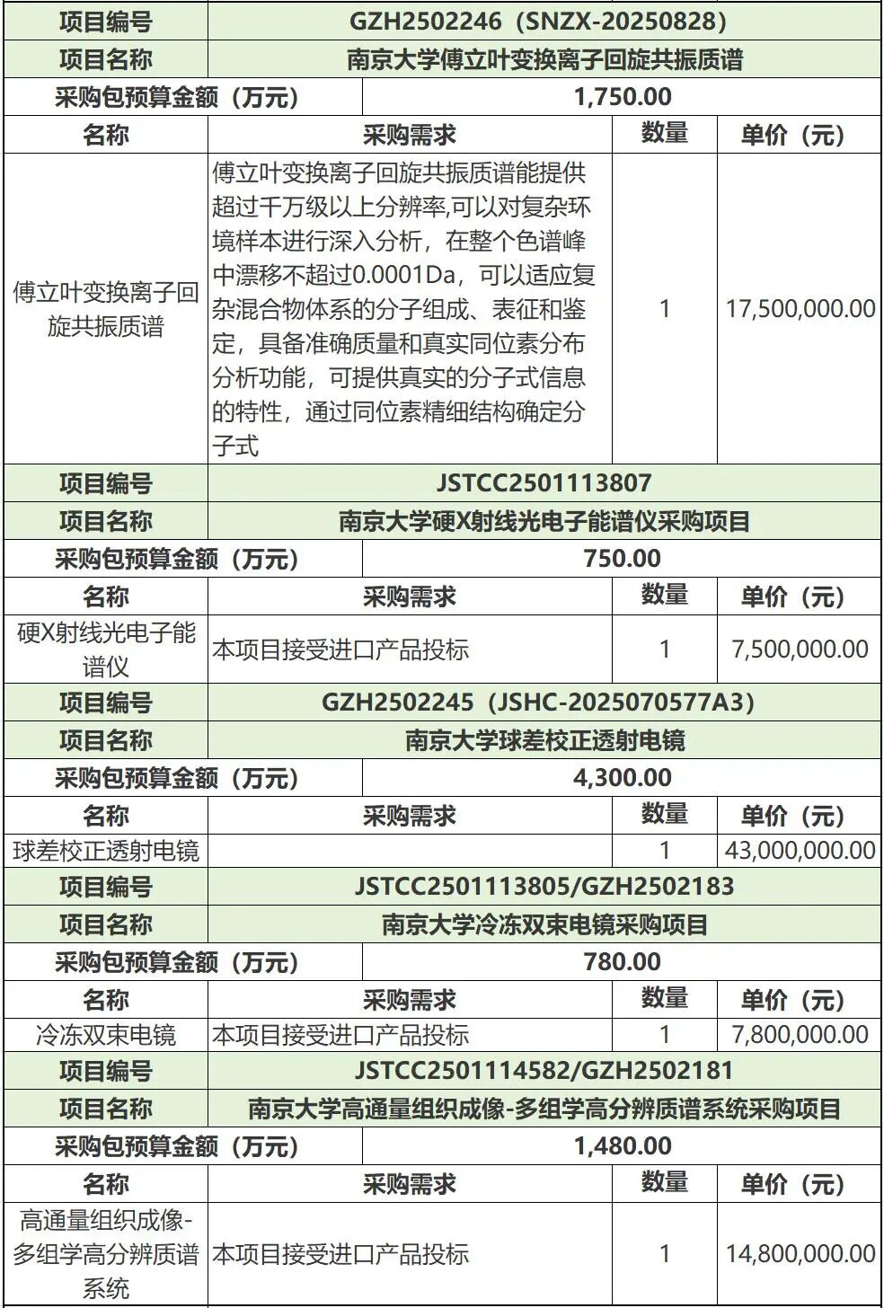 近日,南京大學(xué)多個(gè)科研儀器設(shè)備招標(biāo)項(xiàng)目發(fā)布,采購包括激光剝蝕電感耦合等離子體串聯(lián)質(zhì)譜儀、球差校正透射電鏡、冷凍雙束電鏡、飛秒激光高分辨全元素分析系統(tǒng),熱重紅外氣相色譜質(zhì)譜聯(lián)用儀、傅立葉變換離子回旋共振質(zhì)譜、硬X射線光電子能譜儀、高通量組織成像-多組學(xué)高分辨質(zhì)譜系統(tǒng)、場(chǎng)發(fā)射電子探針顯微分析儀、顯微紅外光譜儀等,總采購金額超1.45億元。