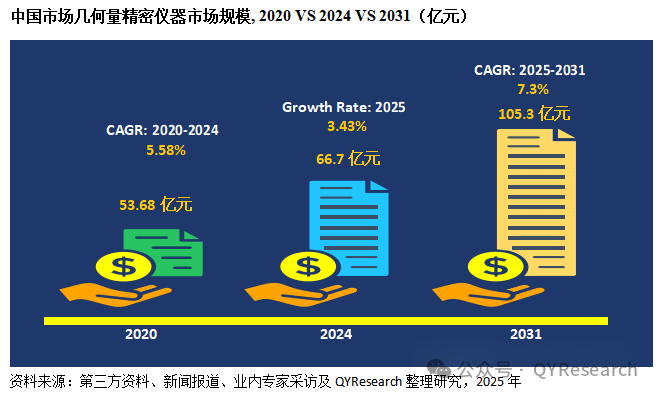幾何量精密儀器是指用于測(cè)量物體長(zhǎng)度、角度、形狀、位置、輪廓、形位誤差等幾何參數(shù)的高精度測(cè)量設(shè)備,是計(jì)量測(cè)試領(lǐng)域的基礎(chǔ)儀器之一,在工業(yè)生產(chǎn)、國(guó)家計(jì)量等領(lǐng)域具有重要作用。根據(jù)研究團(tuán)隊(duì)調(diào)研統(tǒng)計(jì),中國(guó)市場(chǎng)在過去幾年變化較快,2024年中國(guó)幾何量精密儀器市場(chǎng)銷售額達(dá)到了66.7億元,預(yù)計(jì)2031年將達(dá)到105.3億元,年復(fù)合增長(zhǎng)率(CAGR)為7.3%(2025-2031)。