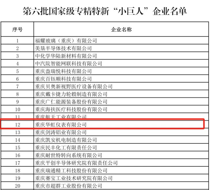 近日工信部公示第六批專精特新小巨人企業和第三批專精特新小巨人復核通過企業名單,重慶新增32家企業復核通過45家企業,其中入駐科學城北碚園區的重慶華虹儀表有限公司成功入圍被認定為專精特新 小巨人企業。