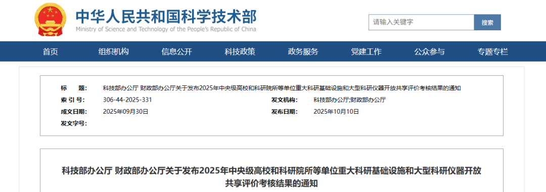 10月10日,科技部辦公廳、財政部辦公廳發(fā)布了《關于發(fā)布2025年中央級高校和科研院所等單位重大科研基礎設施和大型科研儀器開放共享評價考核結果的通知》。