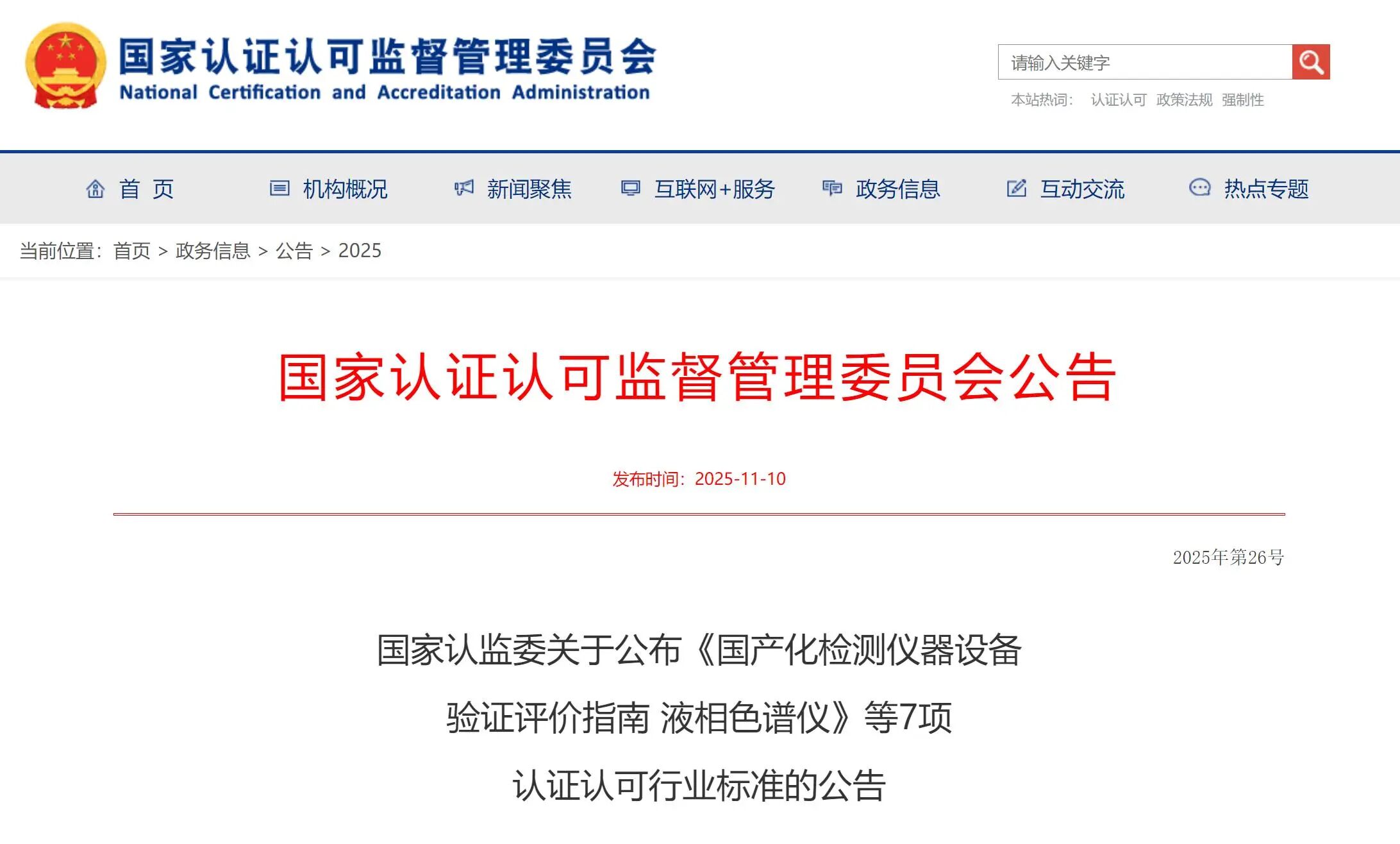 《國產(chǎn)化檢測儀器設(shè)備驗(yàn)證評(píng)價(jià)指南 液相色譜儀》等7項(xiàng)認(rèn)證認(rèn)可行業(yè)標(biāo)準(zhǔn)已經(jīng)國家認(rèn)監(jiān)委審核,現(xiàn)予公告。