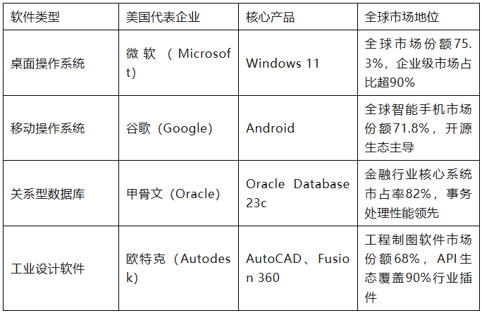 美國企業通過技術標準制定與生態構建形成雙重壟斷。微軟憑借.NET框架與DirectX技術體系,構筑Windows的開發者護城河;甲骨文數據庫以ACID特性與RAC集群技術,成為銀行核心系統的“標配”;Synopsys的EDA工具鏈更是深度綁定全球半導體產業,形成“設計工具-制造工藝”的共生體系。歐洲企業在特定領域補充布局,如法國達索系統的CATIA軟件壟斷航空航天設計市場,德國西門子的PLM系統占據制造業數字化平臺35%份額。