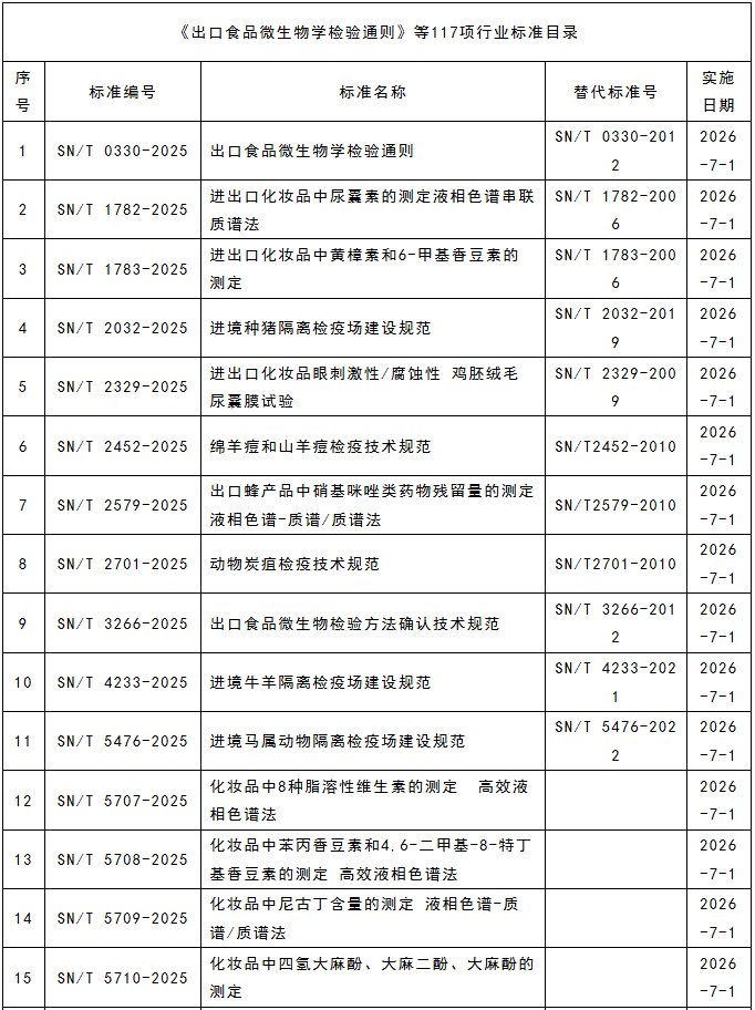1211日,海關(guān)總署發(fā)布《出口食品微生物學(xué)檢驗通則》等117項行業(yè)標(biāo)準(zhǔn)。這些新發(fā)布的行業(yè)標(biāo)準(zhǔn)旨在進(jìn)一步規(guī)范出口食品的檢驗流程,確保出口食品的質(zhì)量與安全,提升我國食品在國際市場上的競爭力。